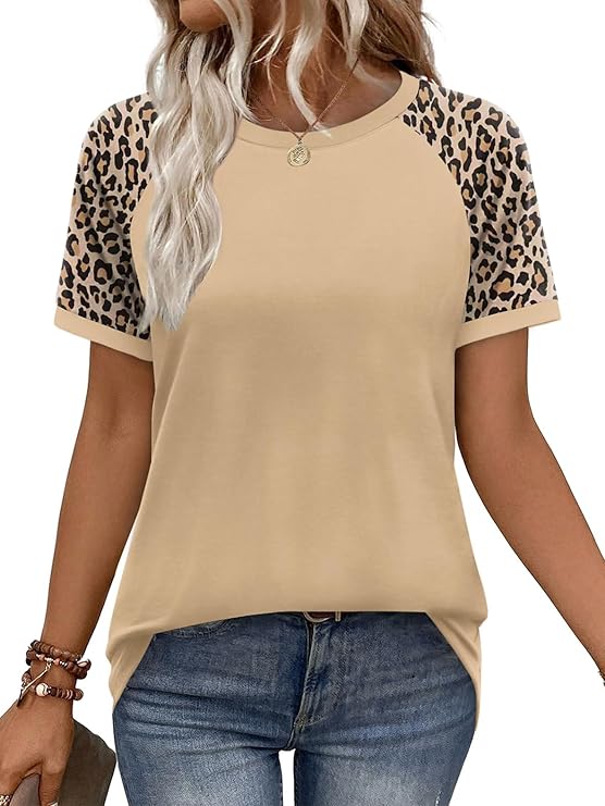• Design: This women’s T-shirt features a minimalist round neck and short sleeves, crafted from a refined fabric with a luxurious feel. The sleeves boast a striking leopard print, instantly elevating its fashion appeal. Wear it to stand out as a unique presence!